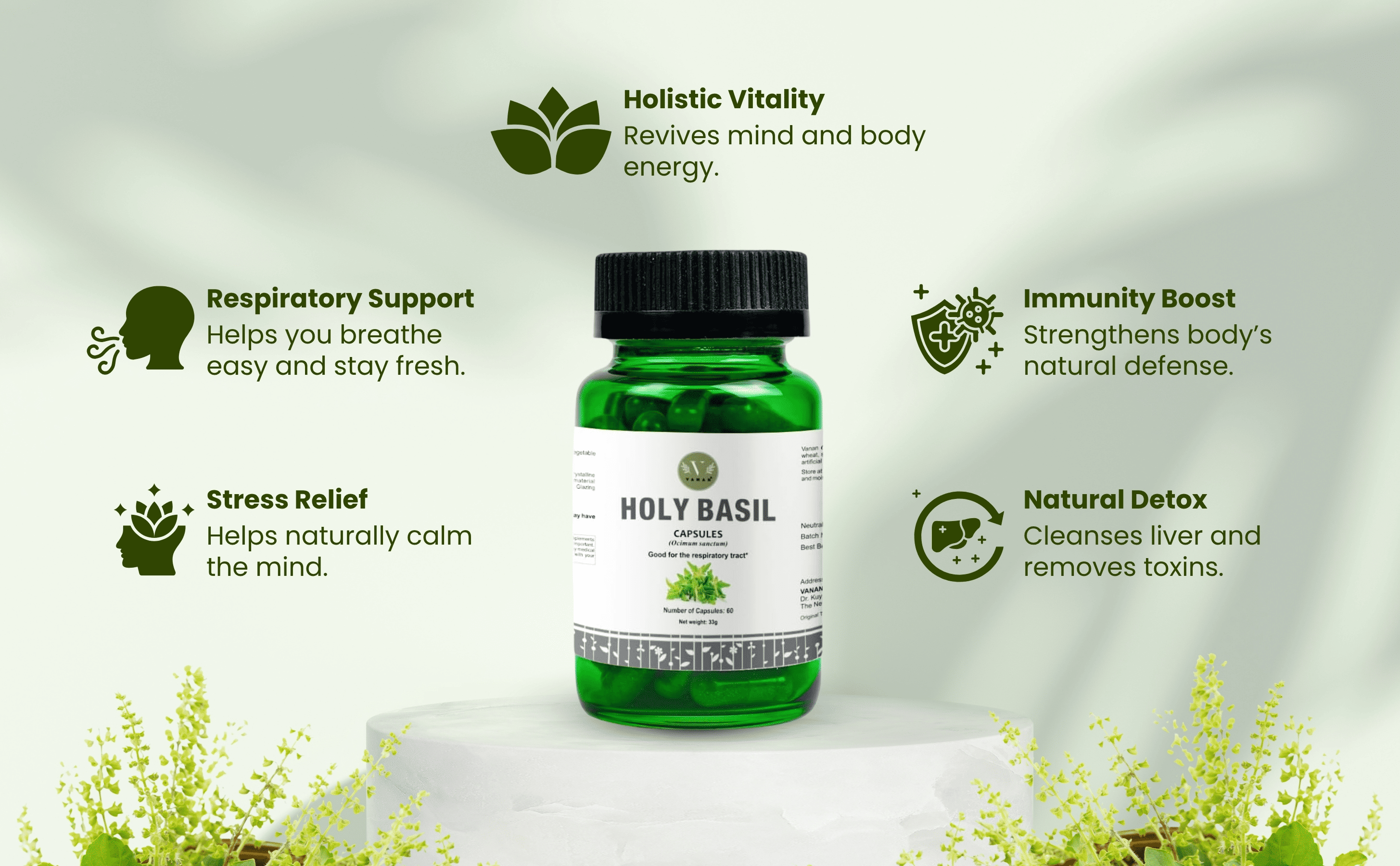 résumé, les capsules de Basilic Sacré conviennent aux personnes cherchant à améliorer leur santé respiratoire, à soulager naturellement le stress et à renforcer leur système immunitaire. Les utiliser de manière responsable et sous supervision peut contribuer à améliorer le bien-être général. Ces capsules offrent un moyen simple d'ajouter les bienfaits des plantes à la santé quotidienne.