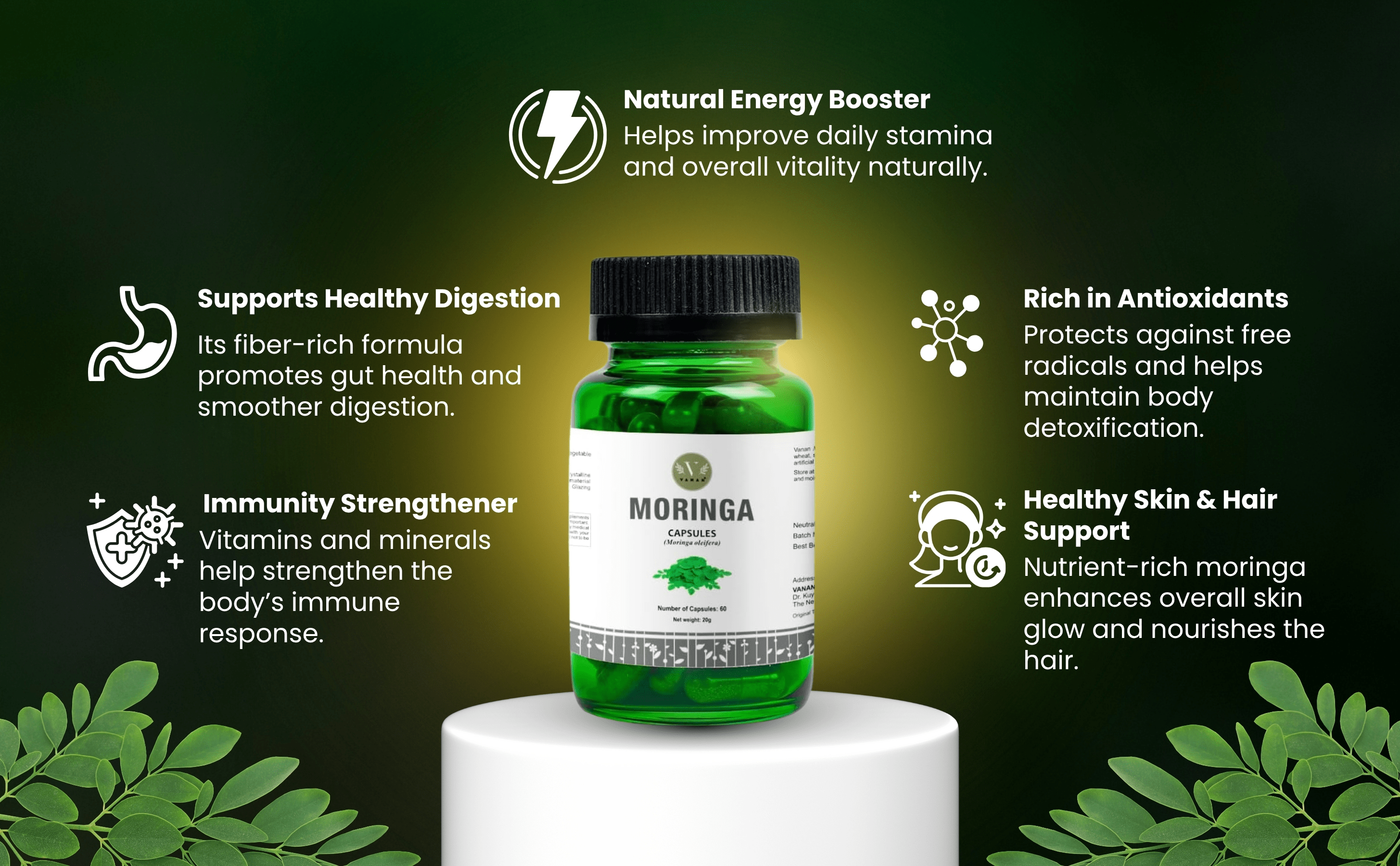 La capsule Vanan Moringa fournit des nutriments naturels qui soutiennent l'immunité, stimulent l'énergie, améliorent le métabolisme et facilitent la digestion pour un bien-être global.
