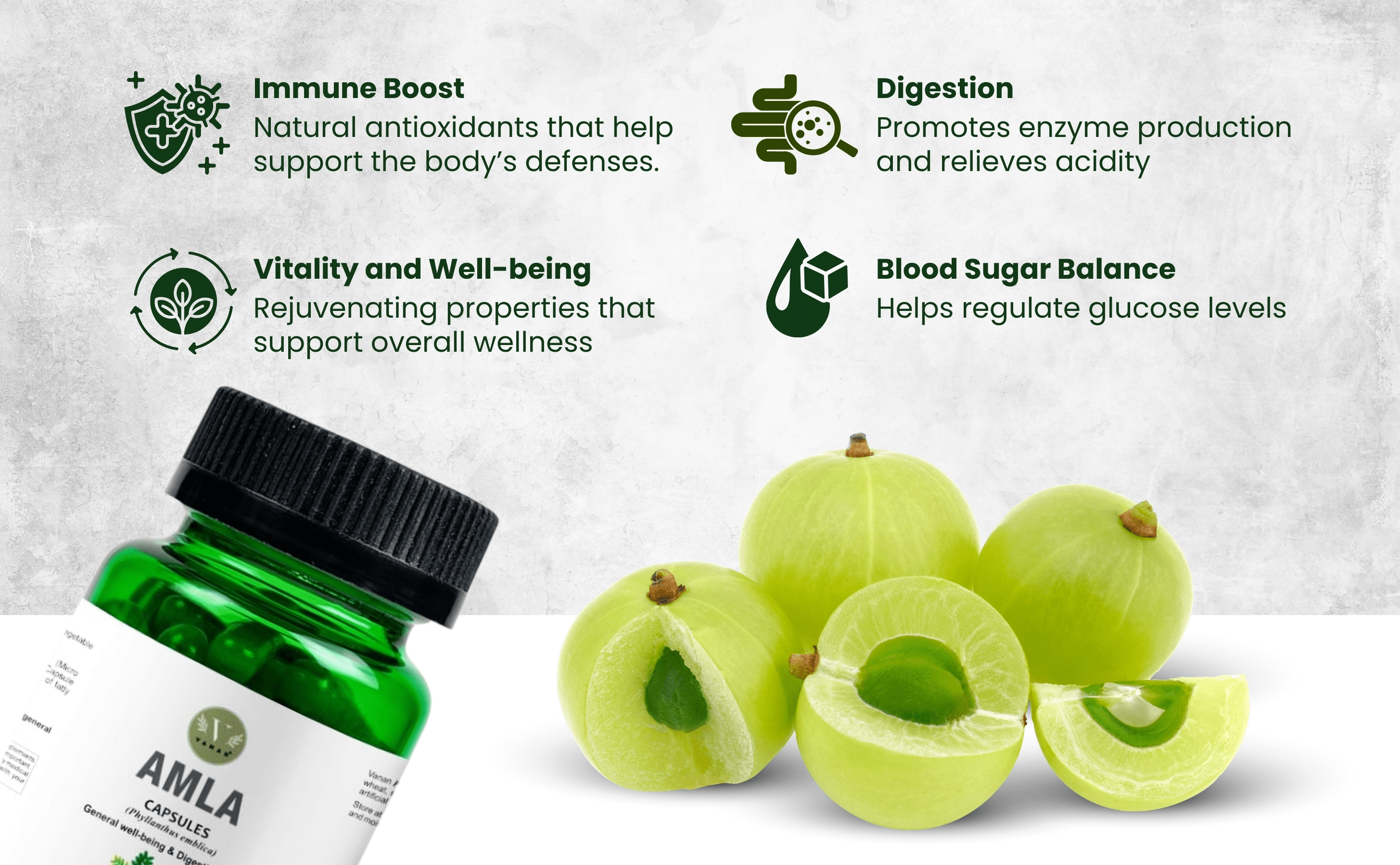 L'Amla è stata utilizzata per secoli nel benessere tradizionale per i suoi numerosi benefici naturali. Ecco alcuni dei modi principali in cui può supportare la tua salute: